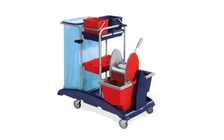 Carrello multiuso Ideabase, composto da: base in plastica con prolunga e ruote Ø 100, montante in acciaio con reggisacco e maniglia (rilsan), montante in acciaio (rilsan), anello di gomma, portapressa in acciaio (rilsan), 2 vassoi in plastica, 3 portamanico in gomma, 2 secchi da 6 lt, 2 secchi da 15 lt e strizzatore per mop.